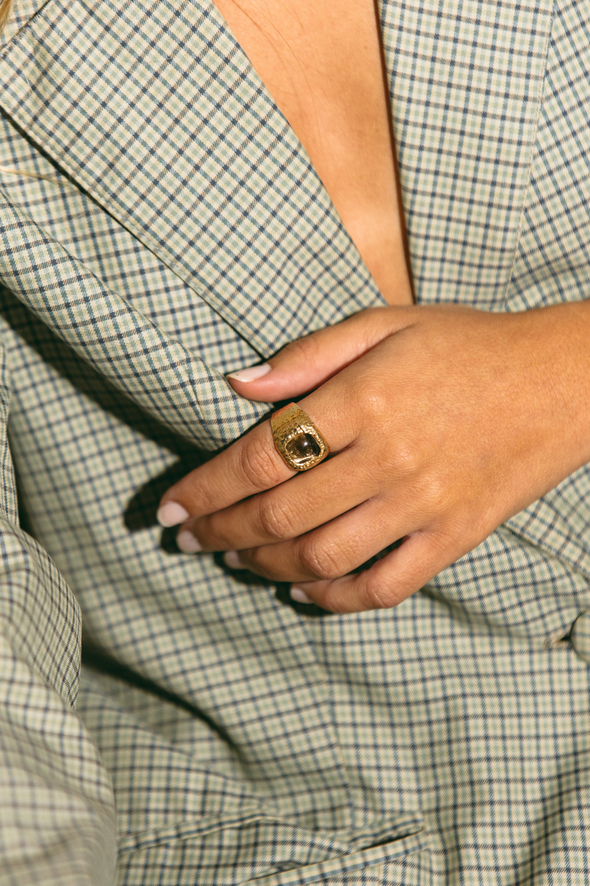 Bold yet elegant, this gold-plated ring features a textured surface and a deep brown stone at the center. A striking piece that adds personality to any look.