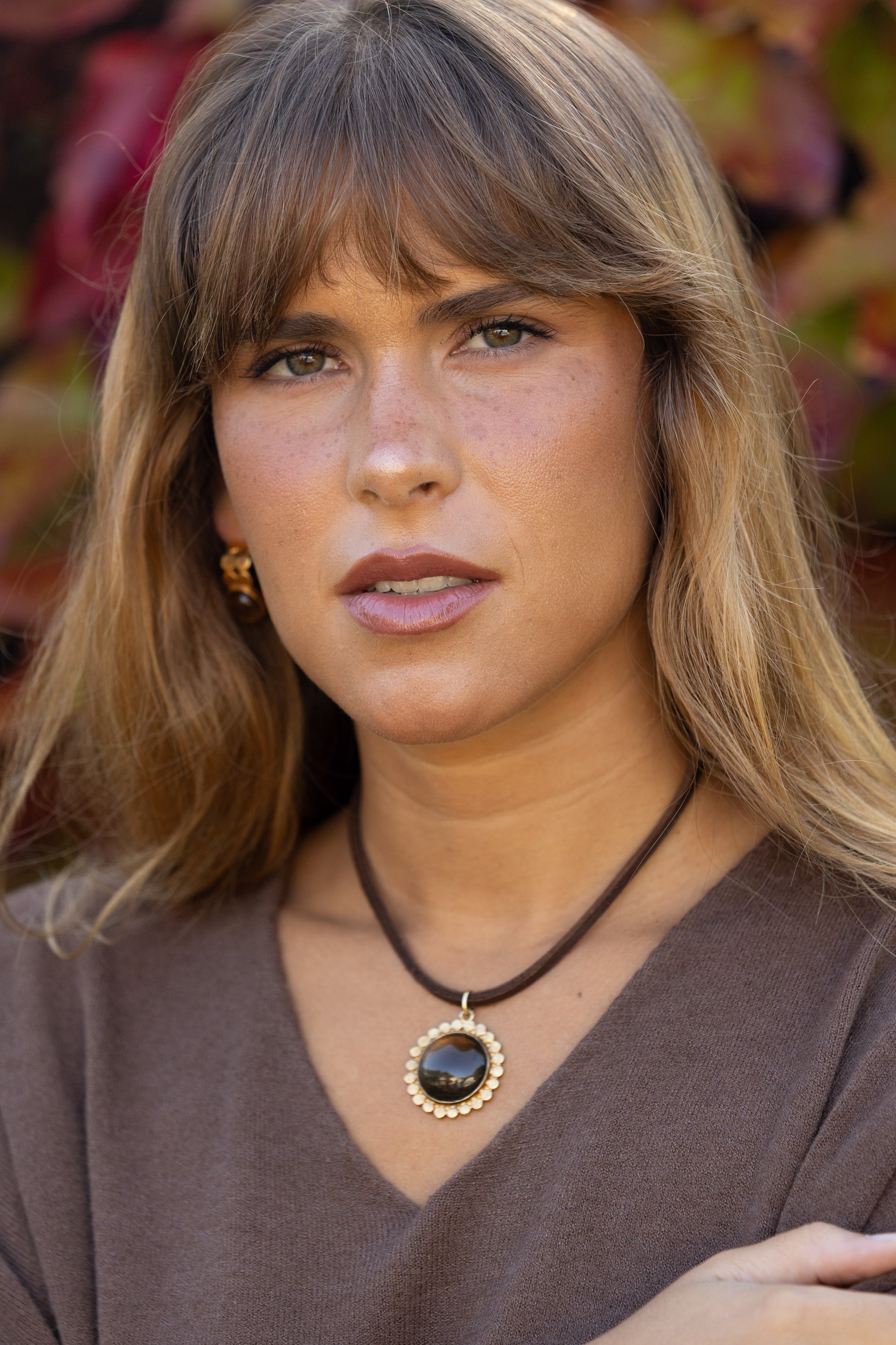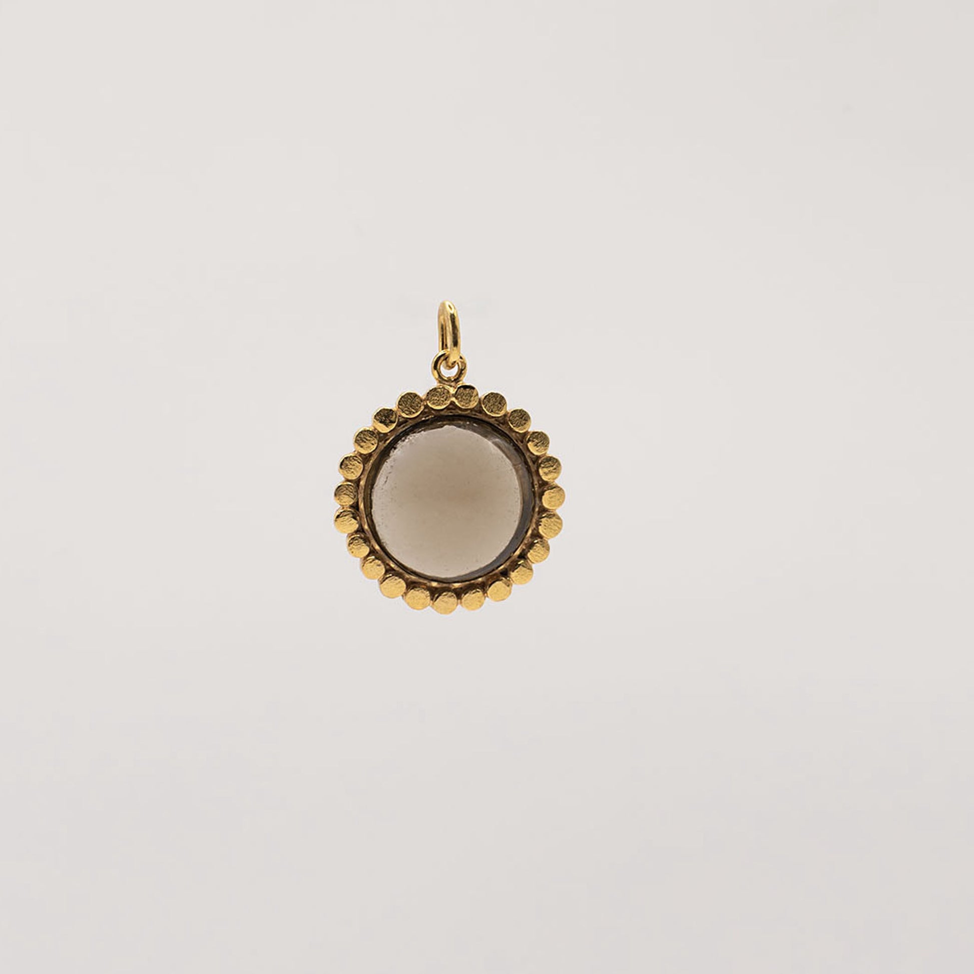 A round pendant with a central brown stone and signature dotted texture around the edge.