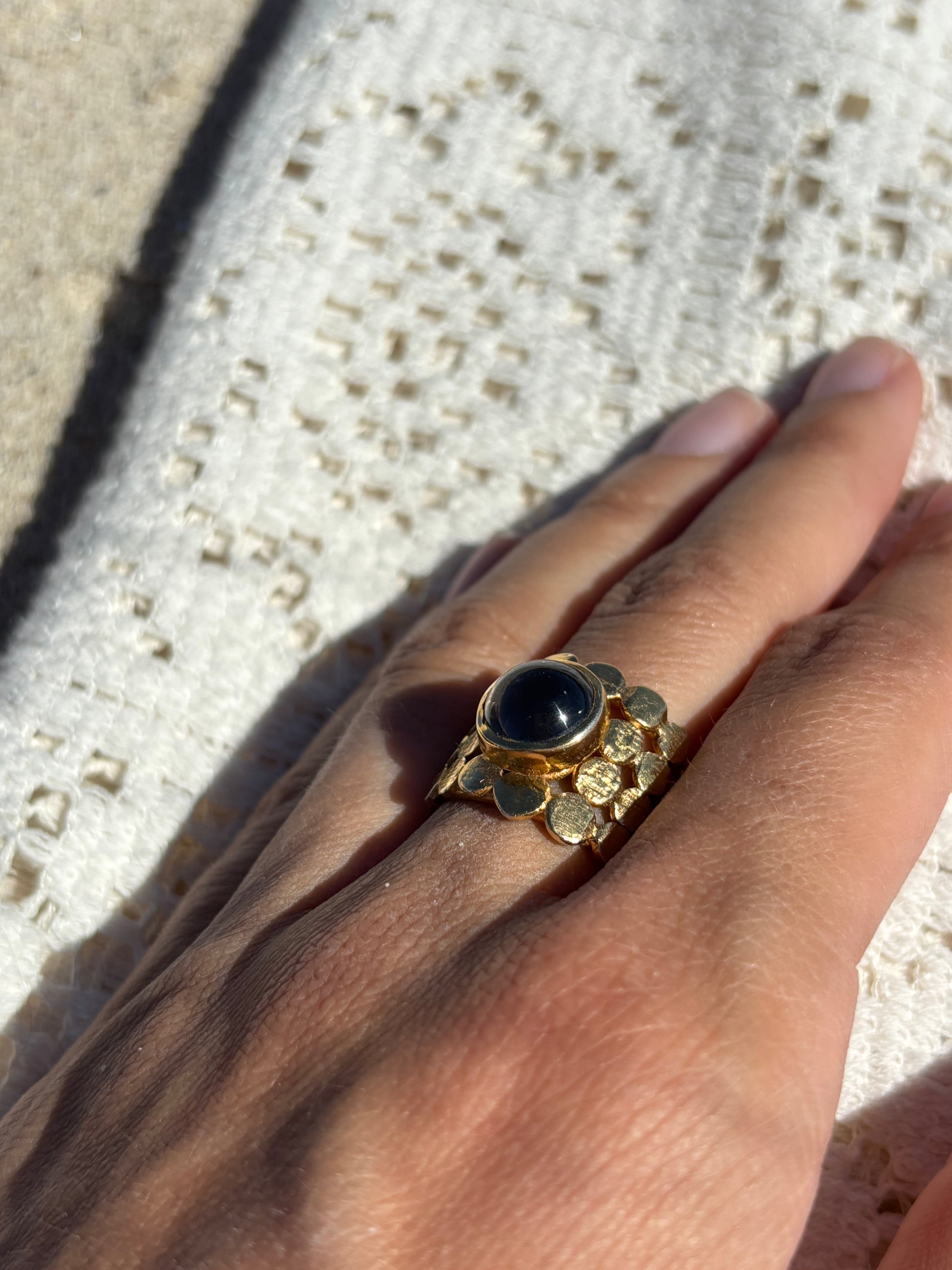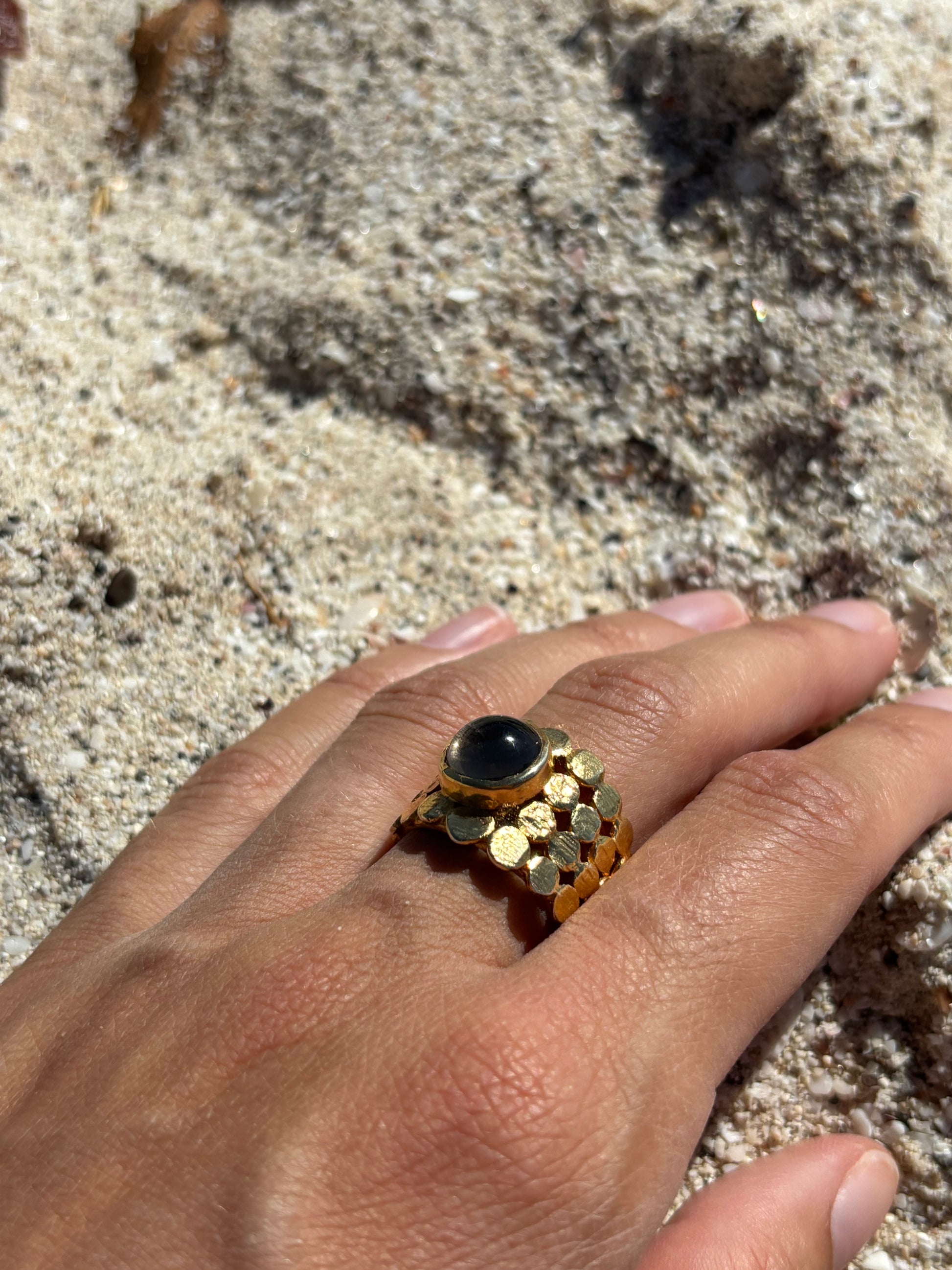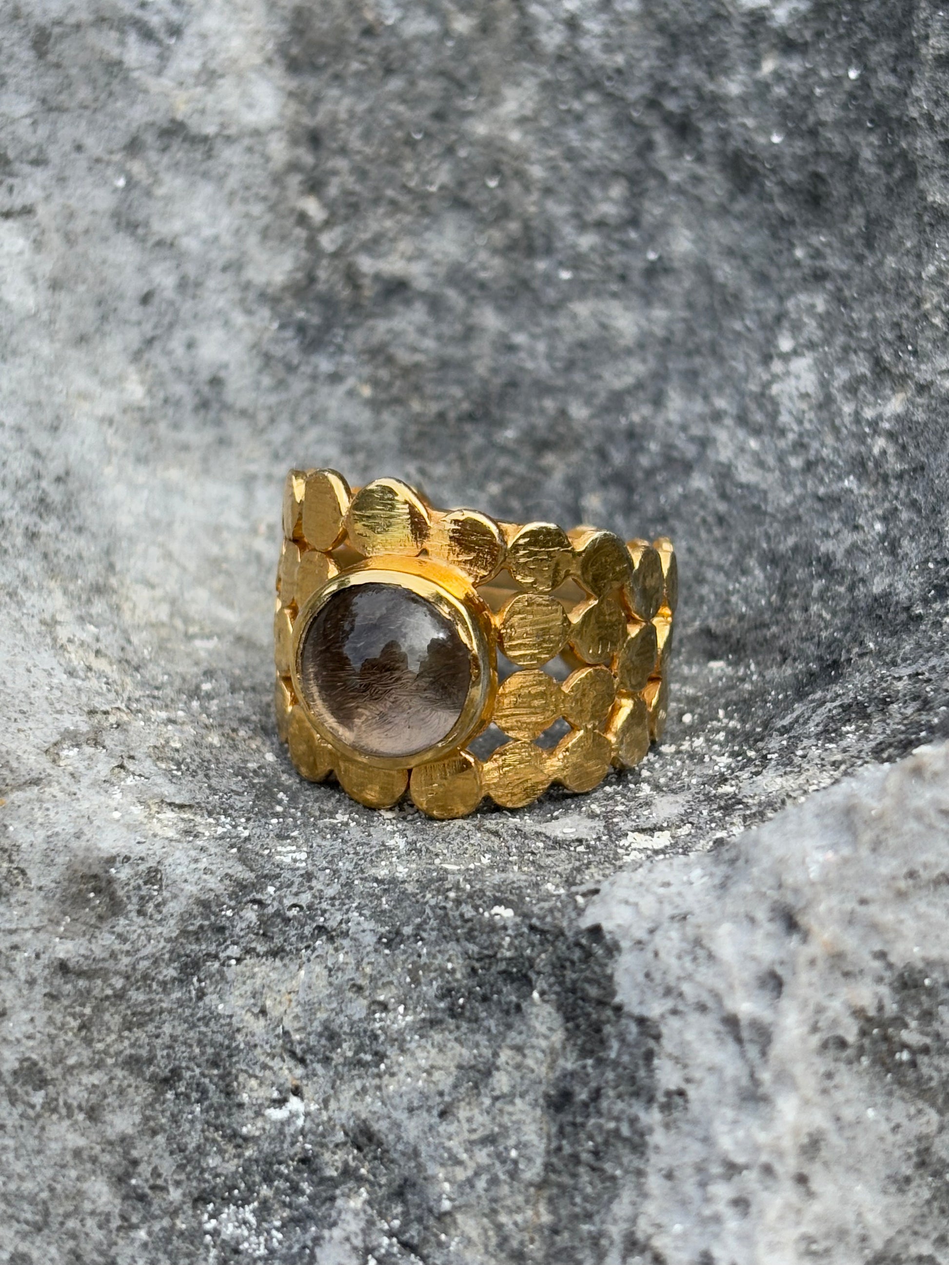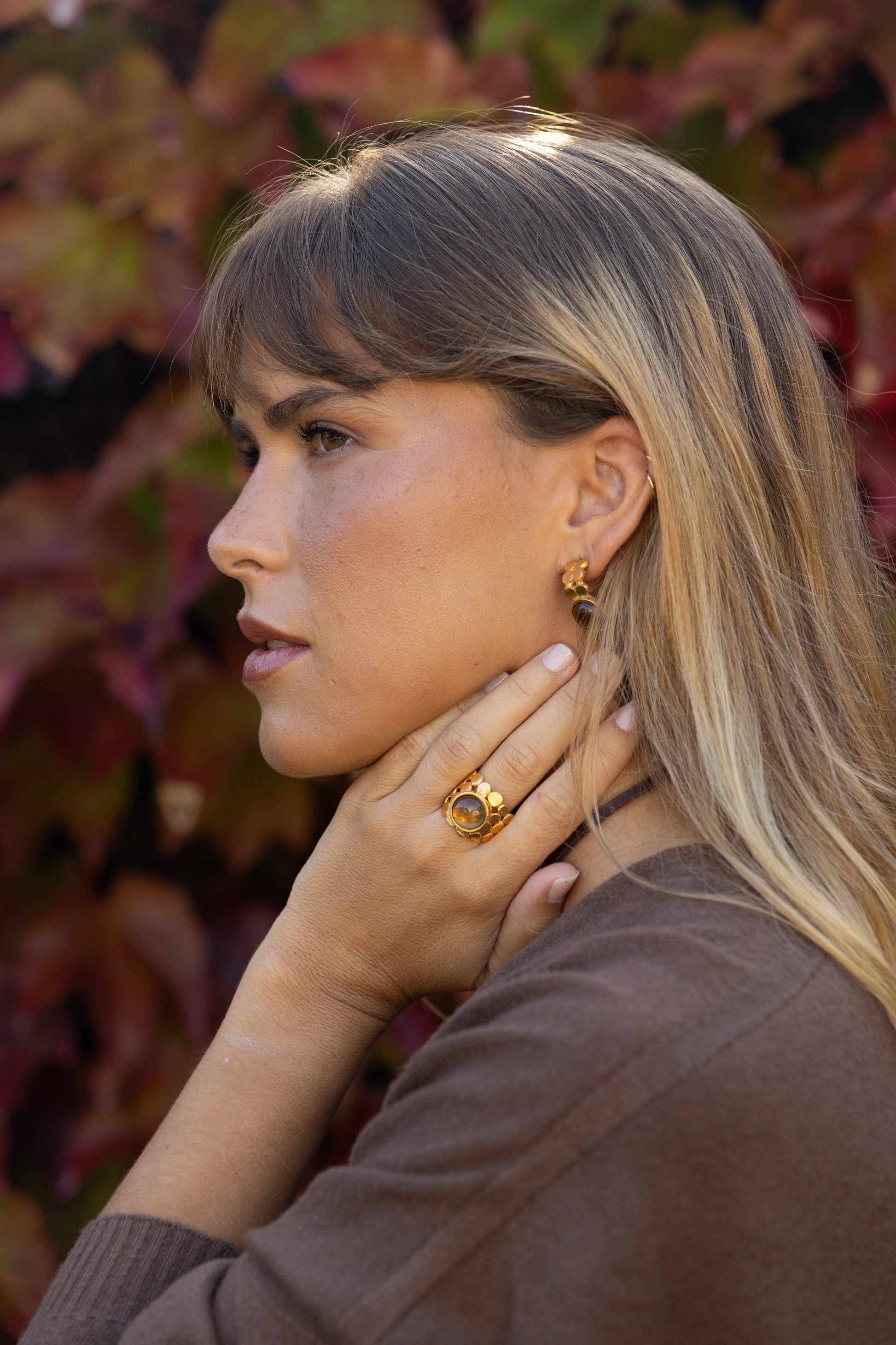 This elegant ring features a raised brown stone set in a textured gold-plated band. A standout piece that plays with light and surface.