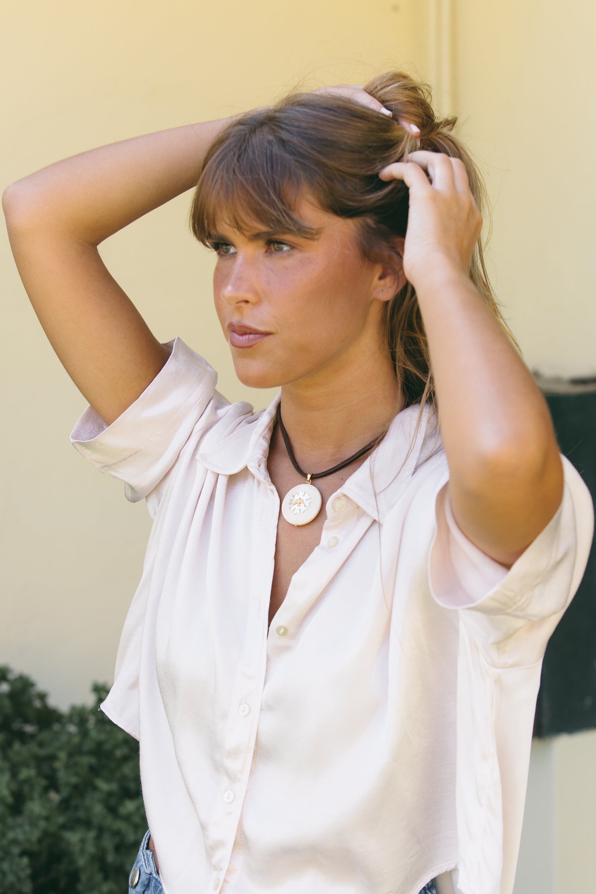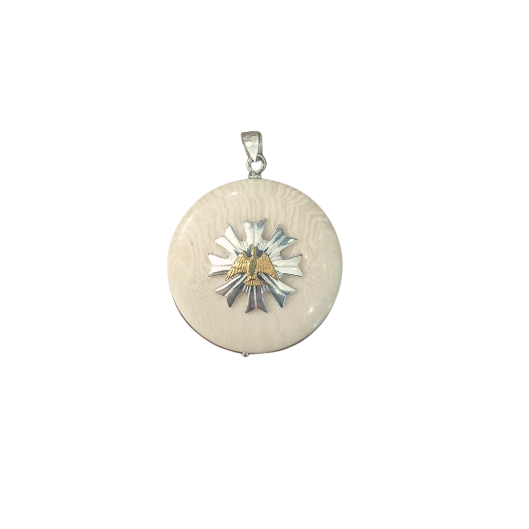 Made from smooth vegetal ivory, this round pendant features a delicate silver and gold-plated Holy Spirit symbol at the center.