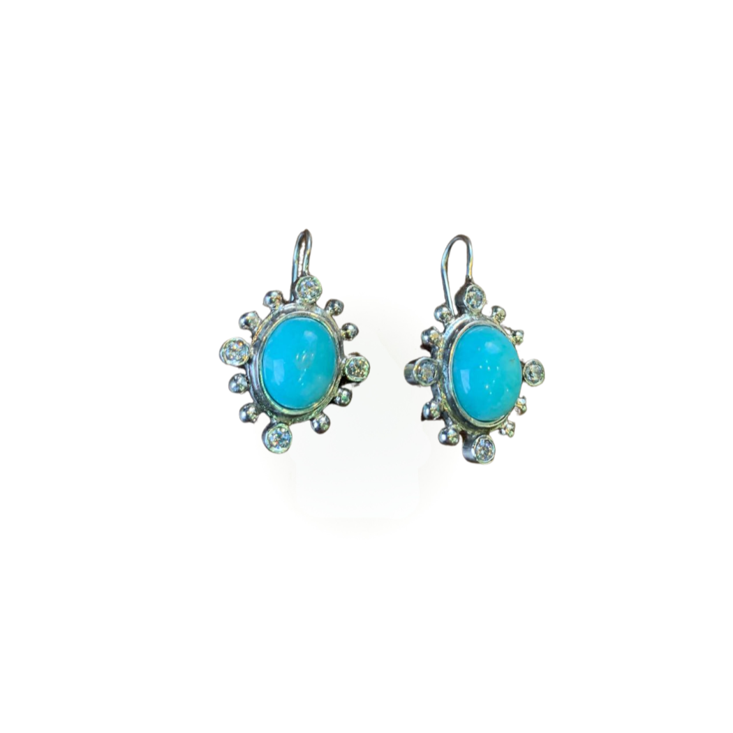 Bright turquoise center stones surrounded by small silver details, these earrings bring a fresh, ocean-inspired glow to your look.